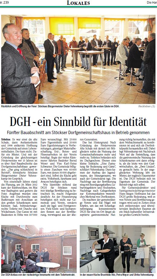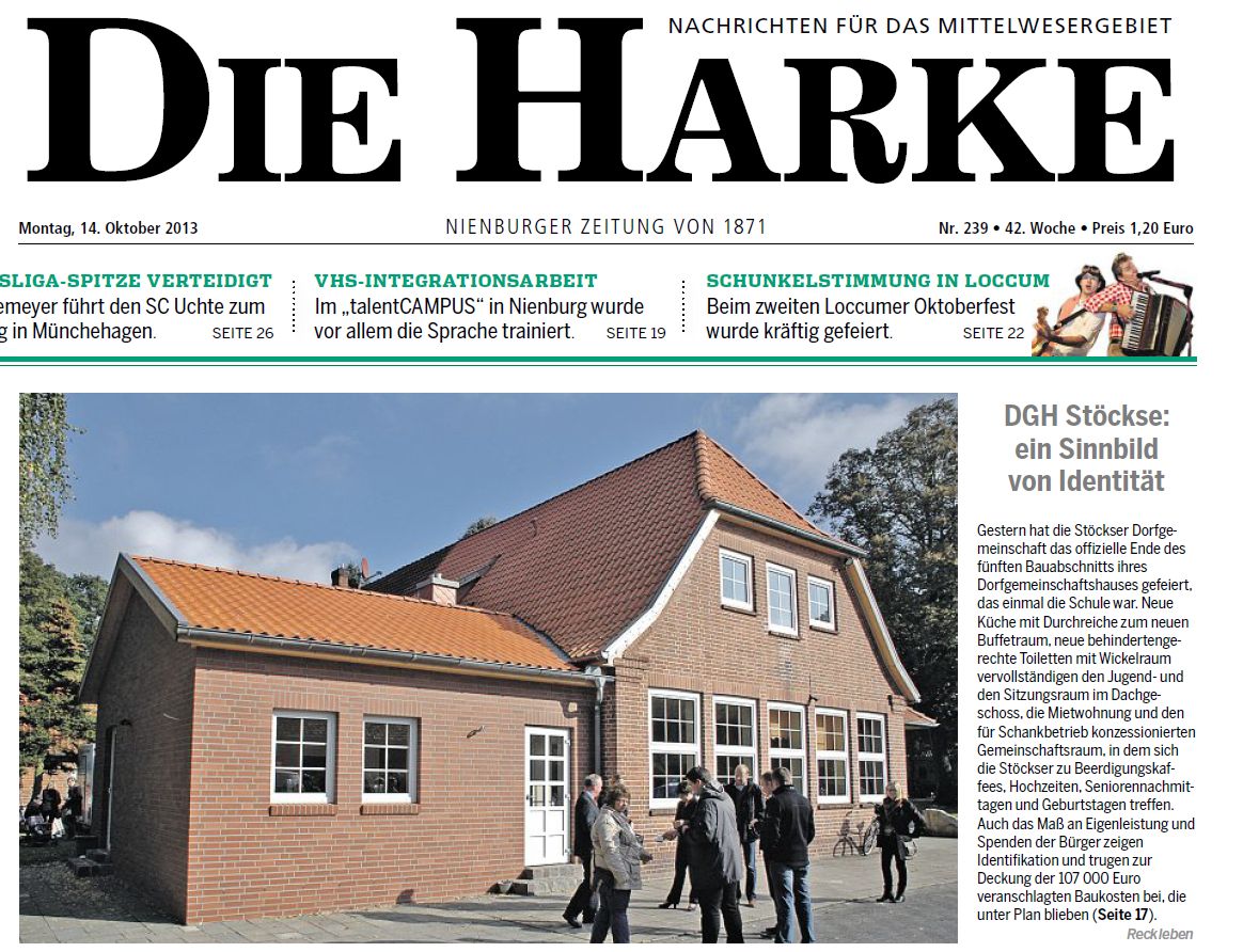 Titelseite und Bericht in der Lokalzeitung "Die Harke" vom 14.10.2013