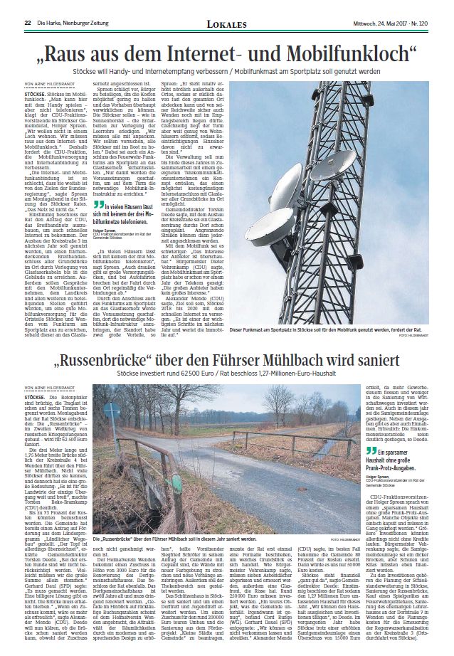 Ganzseitiger Bericht in der Lokalzeitung "Die Harke" vom 24.05.2017