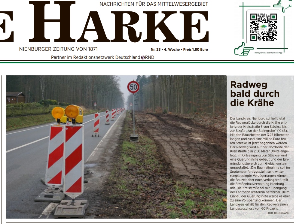 Neuer Radweg entlang der Kreisstraße durch die Krähe - Titelseite! Die Heimatzeitung weiß, was wichtig ist :-)