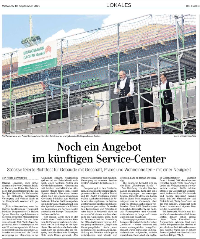 Stöckse, 5. September 2025. „Es ist schön zu sehen, wenn das Dorf auf den Beinen ist“, freute sich Stöckses Bürgermeister Dr. Holger Spreen über das rege Interesse am nächsten erreichten Meilenstein für das ServiceCenter Stöckse: dem Richtfest. Bis zum Sommer sollen ein 24/7 Tante Enso-Supermarkt, eine Hausarztpraxis sowie 20 seniorengerechte Wohnungen mit Betreuungsangebot der Johanniter entstehen und die Grundversorgung der Menschen in der Gemeinde sichern.